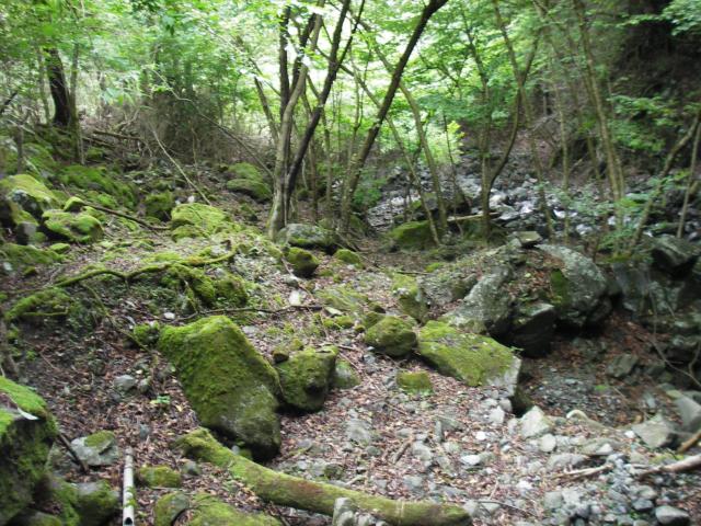 ★林道下を見るとかなり下までゴーロになっている。傾斜は東下駄沢ほどではなさそうなので、ここを下降することにする。ガードレールを跨いで左岸側から沢に降りるが、大き目のゴーロは比較的安定していて、足場には困らない。