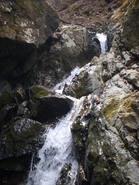 落水をもろにかぶりながら進もうとして全身ずぶ濡れになり、差し出す手先が凍えてしまったので断念。一旦下まで降りて、滝の手前右(左岸)にあるルンゼから巻いた。このルンゼ、岩がかなり脆いが、階段状で簡単に滝上に抜けられる。無理にシャワーを浴びるんじゃなかったと後悔。